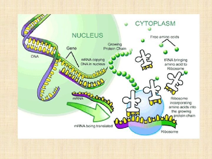 RNA • Messenger RNA (m. RNA) – copies the information from the DNA in the nucleus • Transfer RNA (t. RNA) – reads the information from m. RNA – carries amino acids to the ribosome • Ribosomal RNA (r. RNA)