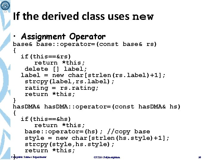 If the derived class does use new class has. DMA : public base { private: char* style; //to point to dynamic memory public: . . . }; • For this class, you will have to define destructor, copy constructor and assignment operator Computer Science Department CPS 235: Polymorphism 33
