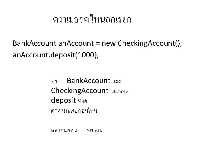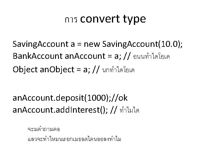 มนกมทตองใช ของตวทเรยกเมธอดไดนอยกวา type เชน Public void transfer(double amount, Bank. Account other){ withdraw(amount); อนนใชใน transfer other. deposit(amount); ได ไง เพราะ transfer มนควรจะใชกบบญชธ } นาคารแบบไหนกได. . Checking. Account my. Acc = new Checking. Account(. . ); mom. Account. transfer(1000, my. Acc);