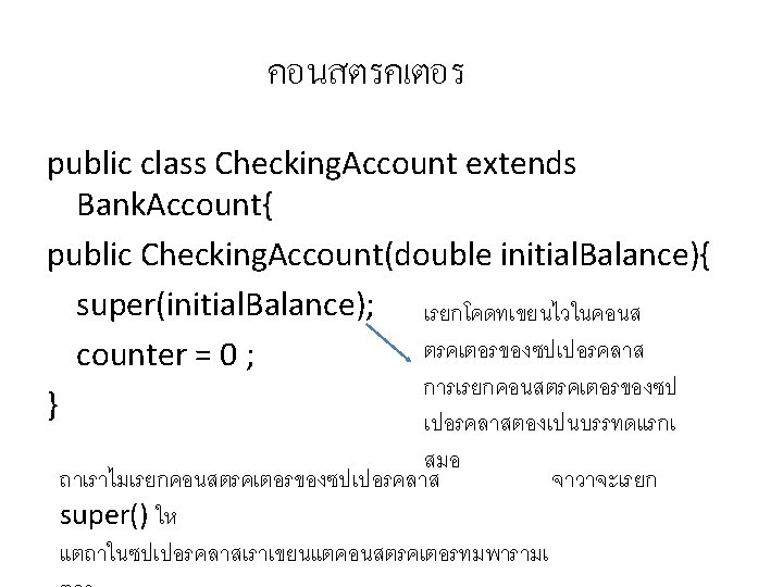 public class Checking. Account extends Bank. Account{ นคอการ override public void deposit(double amount){ counter++ ; // นคอตรงทมเพมมาจากของเดม deposit(amount); //พยายามเรยกเมธอดของ superclass } แตนจะกลายเปนเรยกตวเอง infinite ตองใช super. deposit(amount) แทน