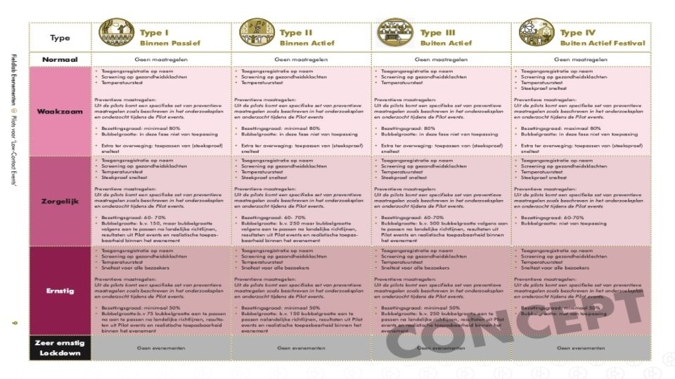 Waar we staan? • Onderzoeksplan bij RIVM • Kabinetsbesluit: groen licht voor periode na half februari 2021 • Organisatie pilot events • Zakelijk congres en theatervoorstelling in Beatrix Theater / Jaarbeurs • Concert en Dance event in Ziggo Dome • Competitiewedstrijden (thuis) van N. E. C. en Almere City FC • Muziek- en dancefestival op het evenemententerrein van Walibi in Biddinghuizen