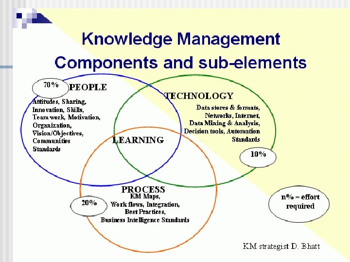 Žinių valdymo elementai: Technologijos – įgalinančios duomenų ir informacijos saugojimą, dalijimąsi, perdavimą, pateikimą n Žmogiškieji ištekliai - žmonės, besinaudojantys informacijos sistemų pateiktu turiniu, jį susiejant su turimomis žiniomis bei patirtimi ir kuriantys naujas žinias. n Procesai - sujungiantys žinių gavimo, saugojimo ir naudojimo technologijų galimybes su žmogiškųjų išteklių galimybėmis, siekiant nestandartinių sprendimų priėmimo ir jų panaudojimo asmenų, organizacijų ar valstybių plėtrai. n