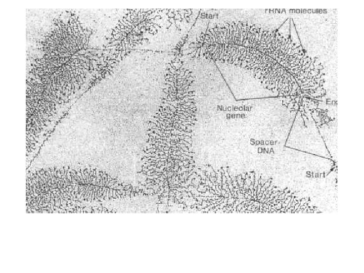 Eukaryotic RNA polymerase 18 S+ 30 proteins= 40 S Poly merase I, III 5. 8 S, 5 S, 28 S+ 5 proteins = 60 S Transcription Factors UCE (upstream control element) 16 S + 21 proteins = 30 S UBF (upstream binding factor) 5 S, 23 S + 34 protein = 50 S SL 1 (TBP= TATA binding protein) (TAF= TBP associated factor) Initiation complex Chemical modifications Methylation Pseudouridine Small nucleolar RNA (sno RNA) Sno RNP Prokaryotic pre-r. RNA 16 S, 23 S, 5 S r. RNA Leader, Trailer, Spacer Rnase III M 16, M 23, M 5 Eukaryotic pre-r. RNA 18 S, 5. 8 S, 28 S r. RNA