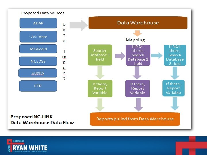 NC ECHO: Key Functions 1) 2 -factor user authentication for high level of security; 2) Matching algorithm to merge client records from multiple data sources; 3) Standard monthly state-level out-of-care (OOC) list reports; 4) Assignment of OOC clients to HD staff for re-engagement services; 5) Standardized reports for monitoring HIV public health; 6) Data extraction tools for creation of customizable data sets. 2016 NATIONAL RYAN WHITE CONFERENCE ON HIV CARE & TREATMENT