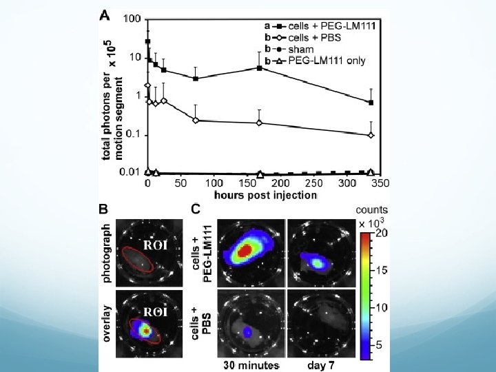 Results Luciferase biomarkers used to track migration of injected cells Two weeks after injection, significantly more cells remained in place when delivered within the biomaterial suspension in comparison to the traditional liquid suspension