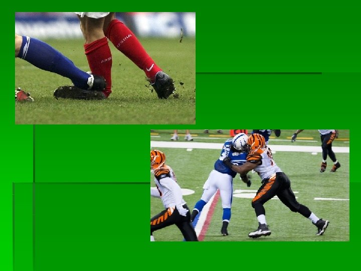 Externally caused injuries Caused by factors other than the performer themselves, such as equipment, opponent and playing conditions. § Foul play – usually involves opponents and these types of injuries can often be quite serious. This is why there are rules to stop them happening. § Impact injuries – Physical impact is permitted within the rules of many sports (rugby, hockey, football) and also happens in many others (basketball). There can also be contact with equipment, (footy boots, hockey sticks, vaulting boxes) and impact with the playing surface itself.
