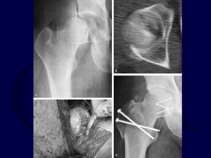 Femoral Head Fracture-Dislocation with Displaced Femoral Neck Fracture • Closed reduction attempts are futile. • ORIF in young: open reduction of hip, then reduction and stabilization of femoral neck and head. • Arthroplasty in middle-aged and elderly (No good results with ORIF reported in literature).
