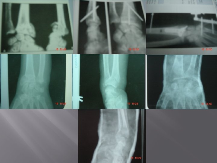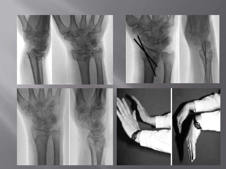 � � Styloid Process Test: Both styloid present at same level in Colle's [Normal radial styloid 1. 3 cm lower than ulnar]. Radiology: X-ray wrist – AP Lateral Treatment Conservative a) Colle's cast : Below elbow cast with 10 -20 o palmar flexion, 15 o-20 o ulnar deviation. b) Above elbow cast in midpronation is BEST. Cast is usually given for 6 weeks. Surgical � Closed reduction and percutaneous K-wire fixation. � Open reduction and fixation using plates and screws � External fixation [for compound fractures and fractures with extensive communition].