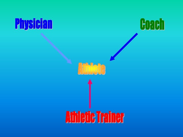 • Athletic Trainer – Athletic trainer works under direct supervision of physician – Work with athletes from time of injury to resolution – Directly responsible for all phases of health care in an athletic environment – Injury prevention – Ensure appropriate training, monitor environment, nutrition, maintain & fitting equipment, appropriate use of medication – Recognition, evaluation, assessment of injuries – Immediate care of injuries and illnesses – Treatment, rehabilitation, and reconditioning – Health care administration – Professional development and responsibility