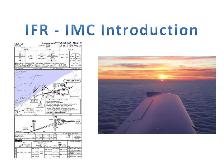Inleiding Aan de hand van deze introductie willen we het algemene niveau van onze piloten de hoogte in jagen. Situational awareness is hierbij van uiterst groot belang en dit leert men door ervaring en door nieuwe zaken te leren. Deze cursus geeft U ook enkele gouden tips mee indien U ongewenst in slecht weer terecht komt. Hoe geraak je eruit? Hoe communiceer je met ATC? Hoe belangrijk is de cockpitscan tijdens het vliegen? Het hoofdprincipe van IFR: Aviate, Navigate, Communicate. IMC - IFR vliegen is GEEN lachertje en vergeeft geen fouten. Gebruik deze informatie enkel in nood of bij perfecte weersomstandigheden. Een ervaren IFR-piloot meenemen is zeker aan te raden als men dit zelf wil verder oefenen. Dit is enkel een demonstratie / introductie en GEEN opleiding !