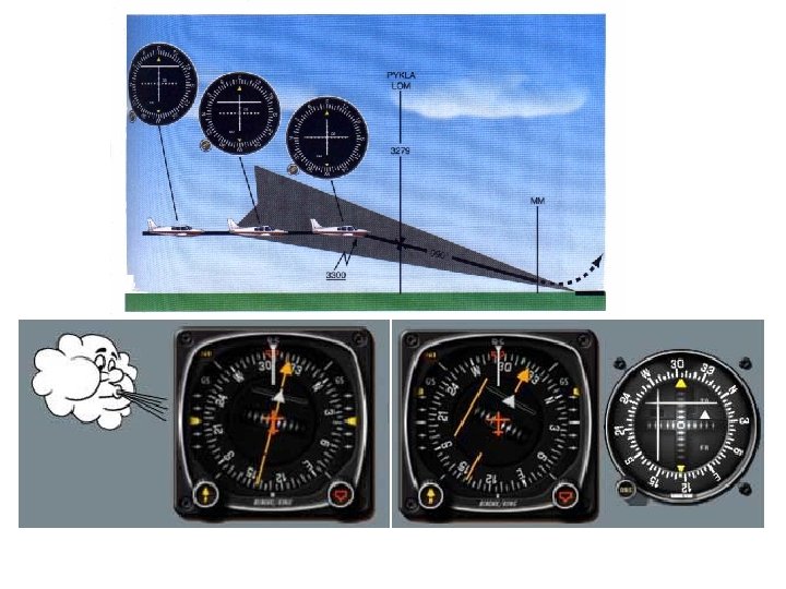 IFR Approaches: de ILS • • • Instrumental Landing System = precisienadering via radionavigatie Glideslope (verticaal) + Localiser (horizontaal) + eventueel DME Meestal 3° glidepath, kan anders (bvb wegens terrein) of “offset” ILS ident zoals een VOR (morse) => OST = 109, 50 & 111, 55 MHz Radio signalen (150 en 90 Hz) die vergeleken worden met elkaar