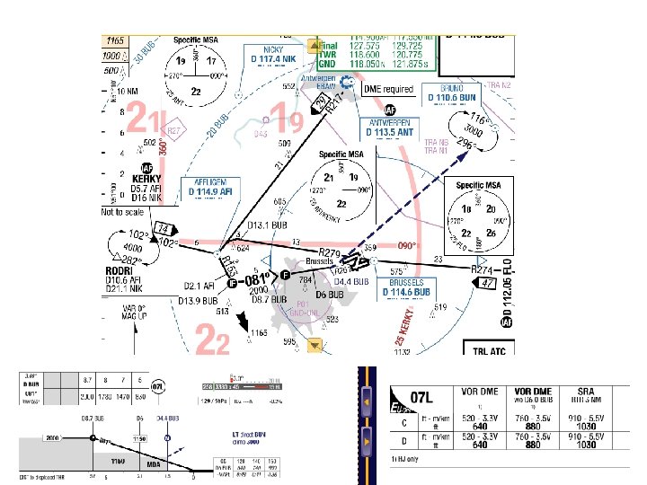 • • • ILS frequentie + ident Final approach course DME from runway Minima’s (ceiling + RVR) Verticaal en horizontaal profiel Go around procedure Andere radio bakens (ONO, DD, . . ) Restricted, Danger zones ATC frequenties