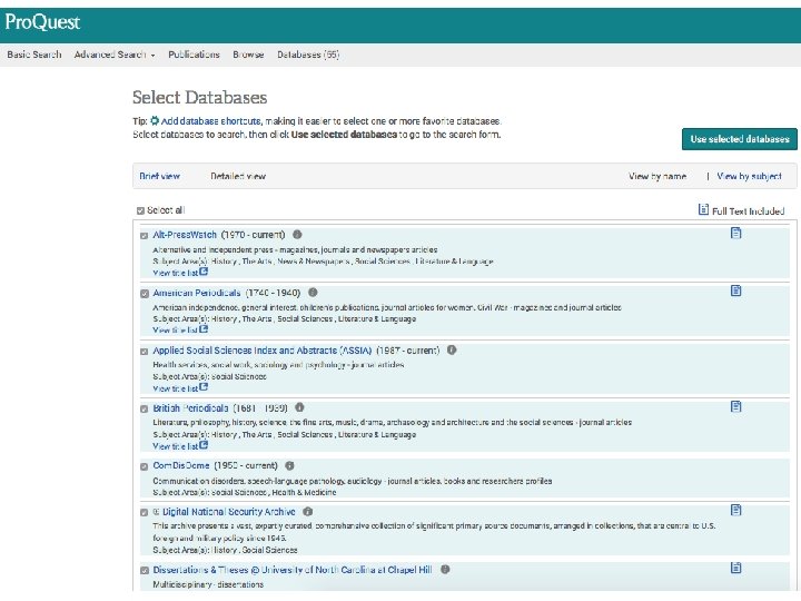 To search across ALL Proquest databases… • Library homepage • E-Research by discipline • Under Frequently Used, select Proquest Dissertations & Theses Global • Once in this particular database, select ALL DATABASES