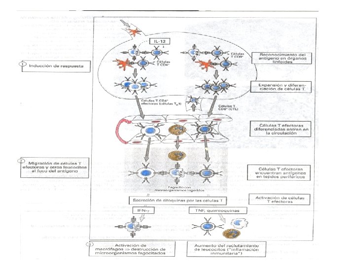 FUNCIONES DE LOS MACROFAGOS ACTIVADOS EN LA INMUNIDAD CELULAR Inducidas por CD 40 y por IFN n Destruyen microorganismos fagocitados y extracelulares. n Estimulan la inflamación por TNF, IL-1 y quimioquinas. n Inducen la formación de tejido de reparación n Se convierten en APC más eficientes por MHC clase II y por IL 12 estimulan la proliferación y diferenciación de linfocitos T. n