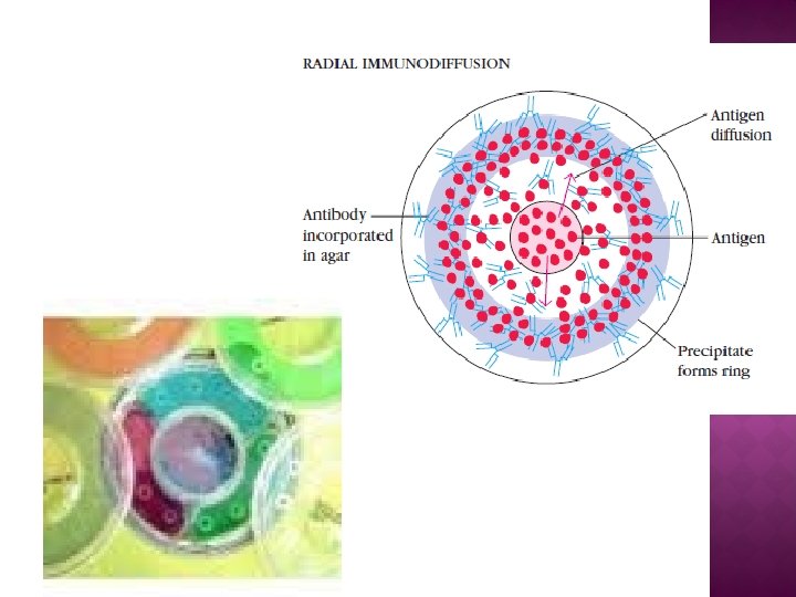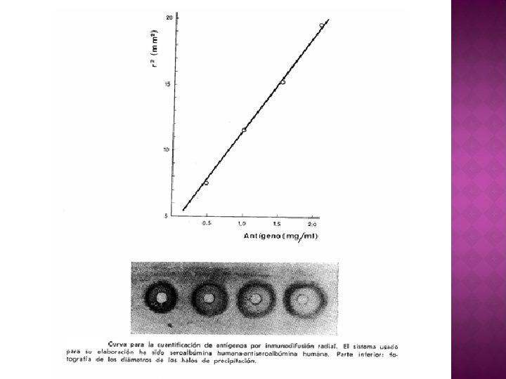 � Es una prueba por lo general monoespecífico (anticuerpos que reconocen sólo determinantes antigénicos propios y característicos del antígeno a valorar), se encuentran en el gel, mientras que soluciones de diferentes concentraciones del antígeno se siembran en pocillos respectivos. � Luego de difundir se formará un halo de precipitación cuyo diámetro será proporcional a la concentración antigénica.