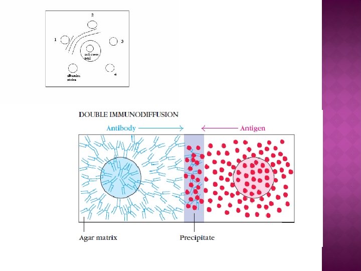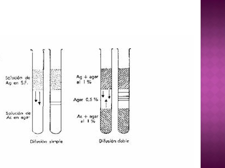 � Los precipitados inmunitarios no sólo pueden formarse en solución sino también en una matriz de agar. � Cuando el antígeno y el anticuerpo se difunden uno hacia el otro en agar, o cuando el anticuerpo se incorpora dentro del agar y el antígeno se difunde hacia la matriz que contiene los anticuerpos, se forma una línea visible de precipitación.