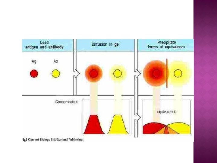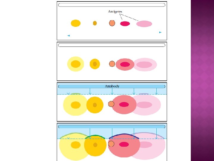 � Tanto el antígeno como el anticuerpo migrarán a la zona media de menor concentración, de manera que, otra vez, se formarán gradientes que harán que en determinado punto los reactivos estén en equivalencia y precipiten. � Si la cantidad de antígeno está en exceso necesitara recorrer una mayor distancia para alcanzar una dilución tal que se encuentre en equivalencia con el anticuerpo y la banda se formará más cerca del fondo