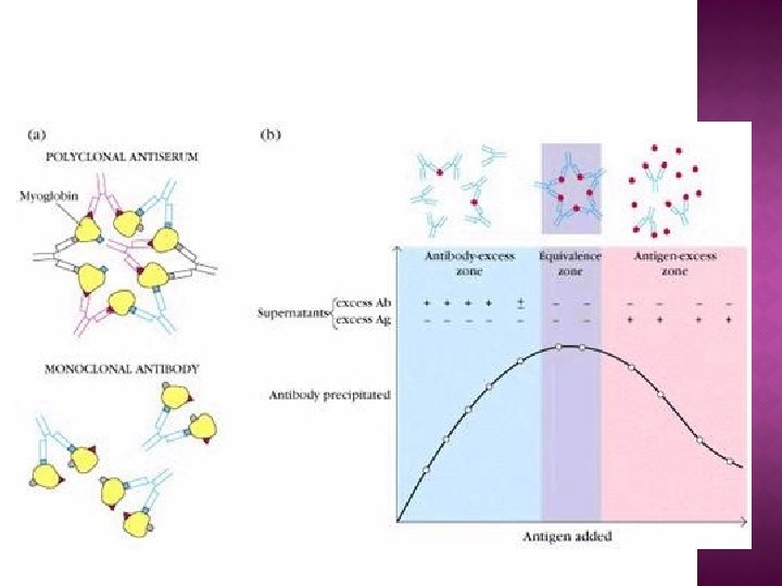� Normalmente la mayor cantidad de precipitado se forma cuando los antígenos y los anticuerpos que reaccionan entre sí se encuentran presentes en proporciones óptimas, o en concentraciones aproximadamente iguales. � Por lo tanto se producen 3 zonas bien diferenciadas, cuando se grafica Ac precipitado vs Ag agregado.