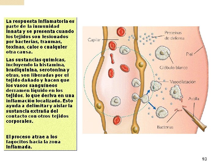 BARRERAS SECUNDARIAS. La barrera secundaria consta de unas células sanguíneas con capacidad de fagocitosis: ØMonocitos: 2 -8% del total de leucocitos, después de permanecer varios días en el torrente sanguíneo, migran a diferentes tejidos (tejido conjuntivo, sinusoides hepáticos) u órganos (bazo, pulmones, médula ósea y ganglios linfáticos) y se transforman en macrófagos, al aumentar su tamaño y su capacidad fagocítica. ØNeutrófilos o micrófagos (50 -70% del total de leucocitos), se encuentran en el torrente sanguíneo y tienen una vida media corta. La sustancias químicas que liberan los tejidos infectados por lo microbios atraen quimiotácticamente a los neutrófilos que salen de los vasos sanguíneos, por diapédesis, atravesando sus paredes, gracias a su movimiento ameboide. Estos tipos de células eliminan los gérmenes mediante fagocitosis, junto a este proceso se desencadena la respuesta inflamatoria en la que se produce: §Dilatación de los vasos sanguíneos locales, con lo que llega más sangre y por tanto , más leucocitos a la zona afectada. §Aumento de la permeabilidad vascular, lo que facilita la salida de plasma de las células sanguíneas.