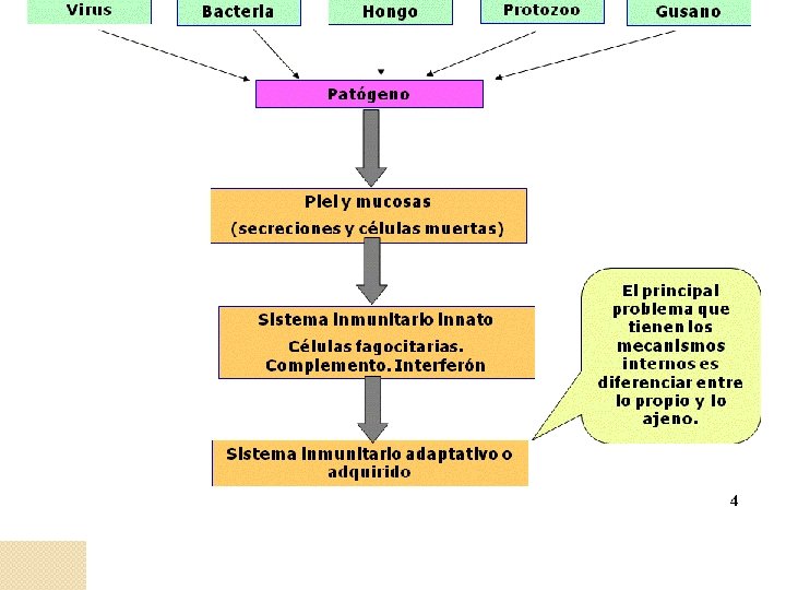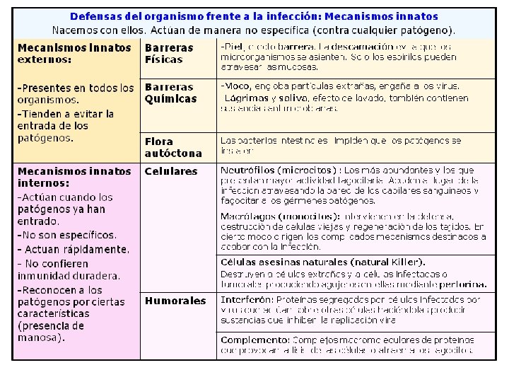 En los organismos animales existen unas barreras defensivas primarias frente a los microorganismos y si estas son traspasadas unas barreras secundarias. Estas barreras son inespecíficas. BARRERAS PRIMARIAS. üLa piel: supone una barrera , gracias a su grosor y al proceso de queratinización y descamación de sus capas celulares externas. También se lleva a cabo este efecto barrera por la secreción de las glándulas sebáceas y del sudor que determinan un PH ácido que resulta perjudicial para la supervivencia de los m. La flora bacteriana de nuestra piel impide el asentamiento y desarrollo de otros microbios que se depositan sobre ella. üSecreciones mucosas: en las aberturas naturales de los animales como la boca, ano, fosas nasales, vías respiratorias, urogenitales y digestivas, las barreras defensivas son las secreciones mucosas que recubren los epitelios. En la saliva , en la secreción lacrimal y nasal existe un enzima, la lisozima, que es capaz de destruir el peptidoglicano de la pared bacteriana. En el esperma se encuentra la espermina de acción bactericida, y las secreciones ácidas del epitelio vaginal y del estomago contribuyen a formar una ambiente desfavorable para la vida y proliferación de los m.
