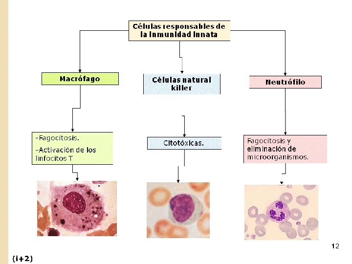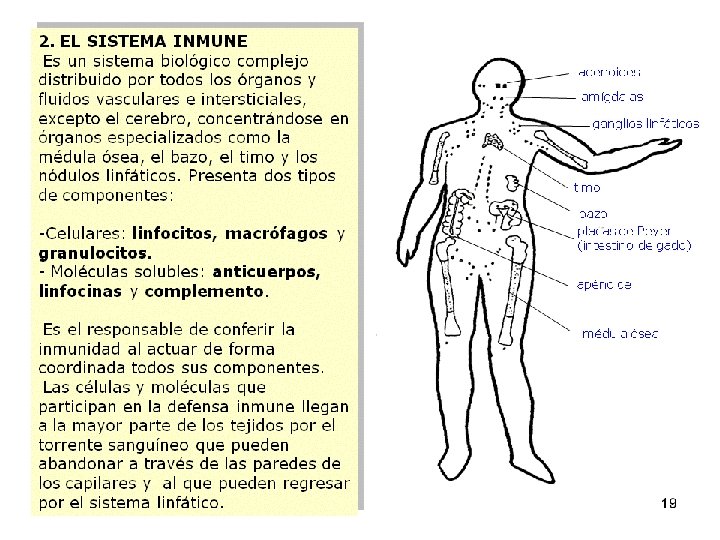 La Inmunología se encarga de estudiar todo lo relacionado con la inmunidad o las infecciones, ( con el sistema inmunitario), es decir con los mecanismos de defensa del organismo. Las células que intervienen en la defensa del organismo derivan de células totipotentes existentes en el embrión. Estas células se diferencian en células madre hematopoyéticas que se sitúan en el interior de la médula ósea. Estas células madre pueden formar cualquier célula sanguínea, desde linfocitos a eritrocitos. Tipos de células: v Eritrocitos: