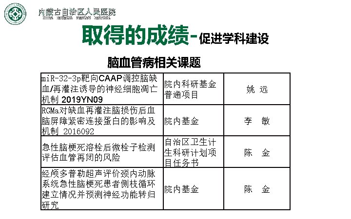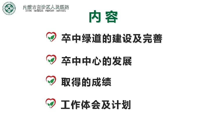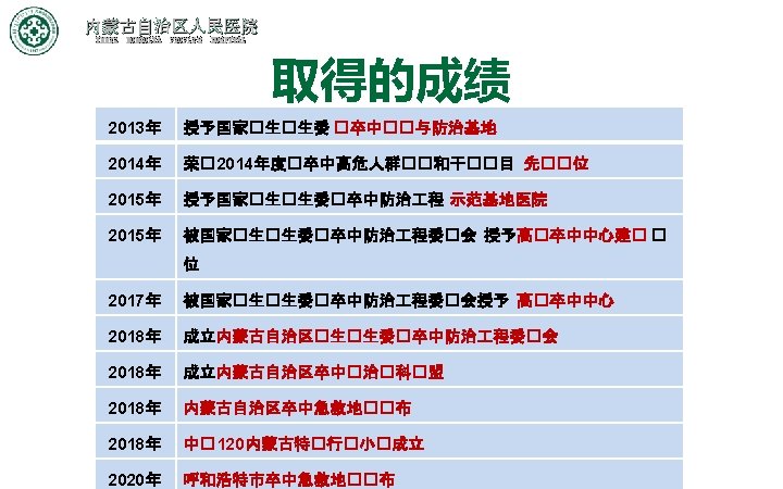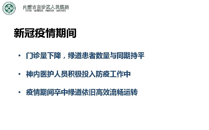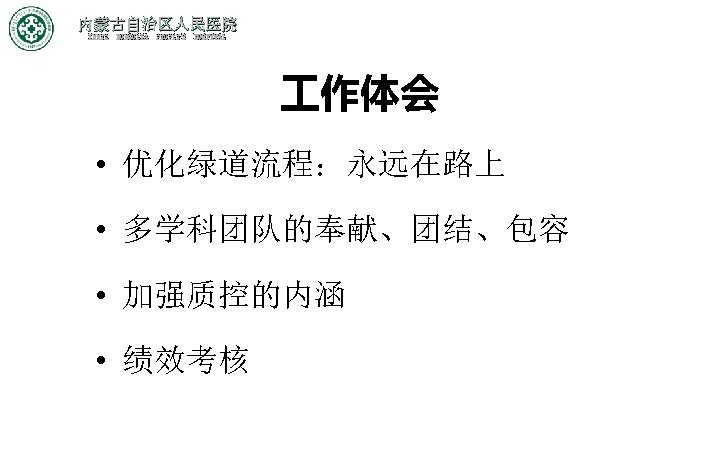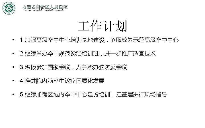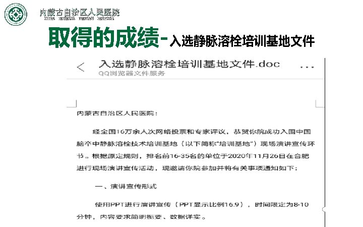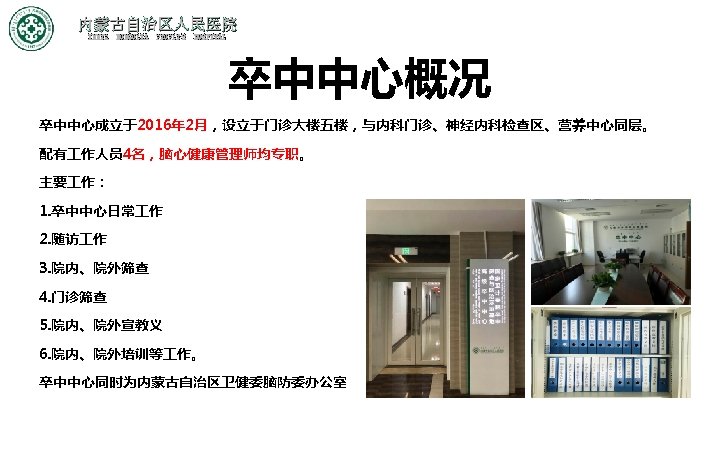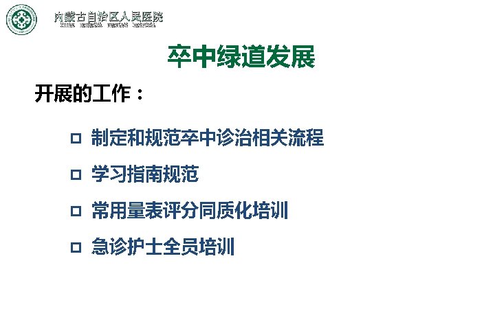 INNER MONGOLIA PEOPLES HOSPITAL INNER MONGOLIA PEOPLES HOSPITAL Slides: 42 Download presentation 内蒙古自治区人民医院 INNER MONGOLIA PEOPLE'S HOSPITAL 卒中绿道发展 内蒙古自治区人民医院 INNER MONGOLIA PEOPLE'S HOSPITAL 卒中急救地图 内蒙古自治区人民医院 INNER MONGOLIA PEOPLE'S HOSPITAL 质控会议 内蒙古自治区人民医院 INNER MONGOLIA PEOPLE'S HOSPITAL 质控会议 内蒙古自治区人民医院 INNER MONGOLIA PEOPLE'S HOSPITAL 卒中中心建设 作 内蒙古自治区人民医院 INNER MONGOLIA PEOPLE'S HOSPITAL 卒中中心成立(2016) 内蒙古自治区人民医院 INNER MONGOLIA PEOPLE'S HOSPITAL 卒中中心委员会成立(2018) 内蒙古自治区人民医院 INNER MONGOLIA PEOPLE'S HOSPITAL 第二期 2019. 12. 10 内蒙古自治区人民医院 INNER MONGOLIA PEOPLE'S HOSPITAL 激励政策与落实 内蒙古自治区人民医院 INNER MONGOLIA PEOPLE'S HOSPITAL 激励政策与落实 内蒙古自治区人民医院 INNER MONGOLIA PEOPLE'S HOSPITAL 疫 情 期 间 的 作 内蒙古自治区人民医院 INNER MONGOLIA PEOPLE'S HOSPITAL 内蒙古自治区人民医院 INNER MONGOLIA PEOPLE'S HOSPITAL THANKS!