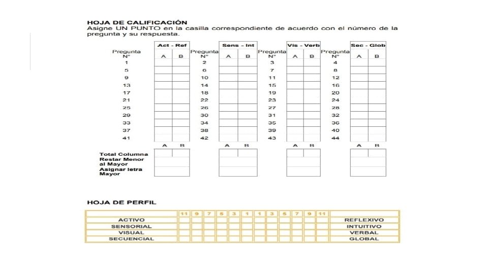 Puntaje en escala entre 1 y 3: se presenta un equilibrio apropiado entre los dos extremos de la escala. Puntaje entre 5 y 7: usted presenta una preferencia moderada hacia uno de los dos extremos de la escala y aprenderá más fácilmente si se le brinda apoyo en esa dirección. Puntaje entre 9 y 11: se presenta una preferencia muy fuerte por uno de los dos extremos de la escala, puede presentar dificultades para aprender en un ambiente en el cual no tenga apoyo en esa dirección.