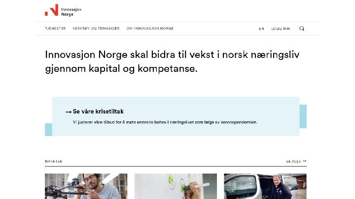 Innovasjonslån • Renter redusert med 1, 0 prosentpoeng på lavrisikolån og 1, 25 prosentpoeng for risikolån. • Ekstra utlånsramme på 1, 6 mrd. kroner • Målgruppe: SMB med vekstambisjoner • Delfinansiering av prosjekter som bidrar til nyetableringer, nyskaping, omstilling, internasjonalisering og utvikling • Vi skal være med å løfte bedriftene slik at de etter covid er i posisjon via innovasjonsprosjekter til å vokse og lykkes