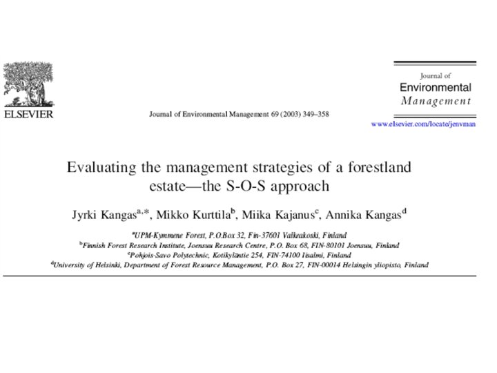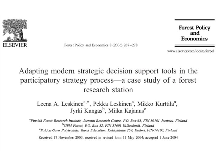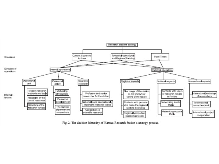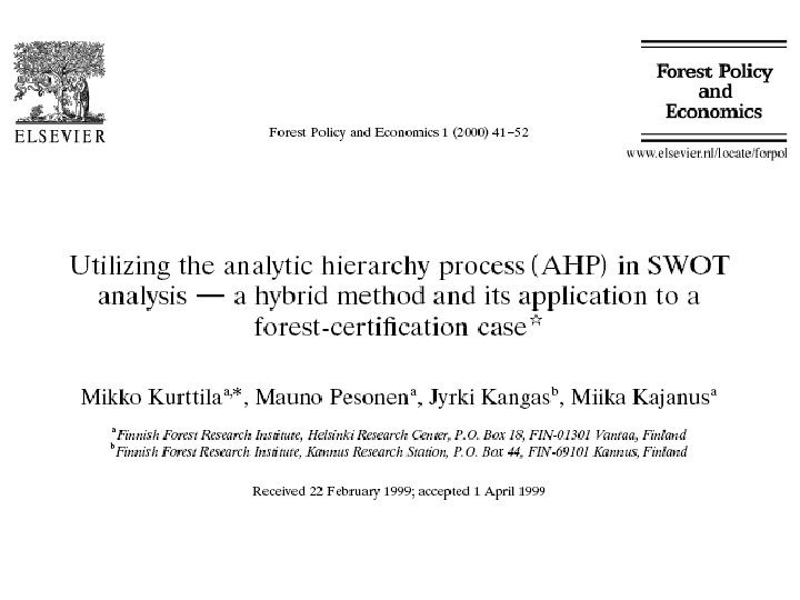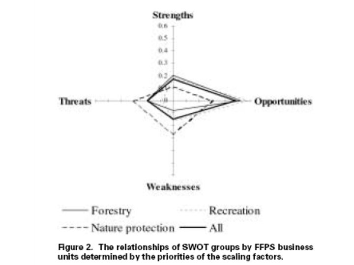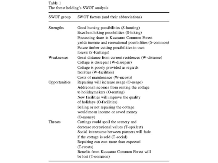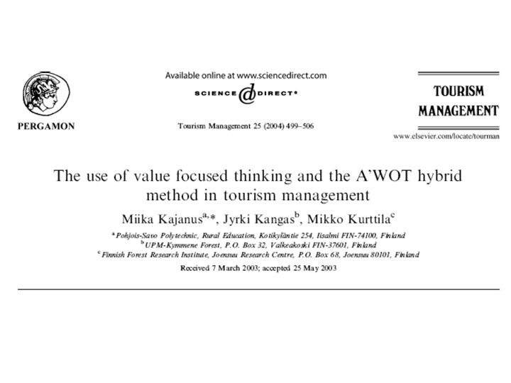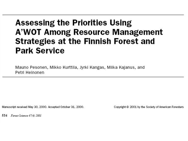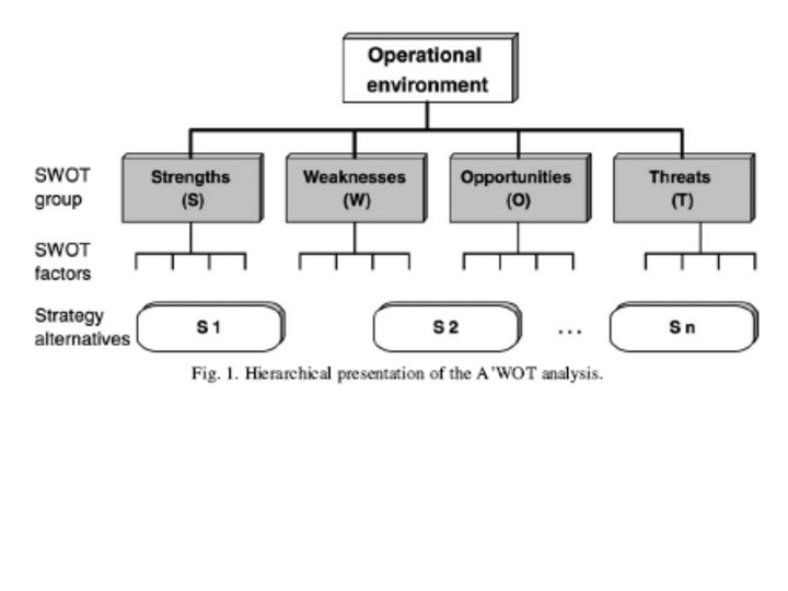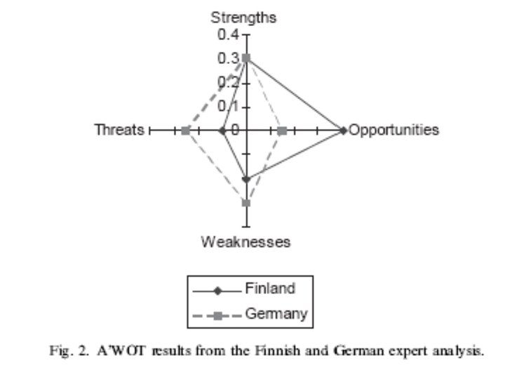 AWOT method • Connecting Multi Criteria Decision Support (MCDS) methods with SWOT (Strengths, Weaknesses, Opportunities, and Threats) analysis • SWOT analysis provides the basic frame for the analysis • MCDS methods assist in carrying out SWOT more analytically and in elaborating the results of the analyses so that decisions can be prioritized also with respect to the entire SWOT.