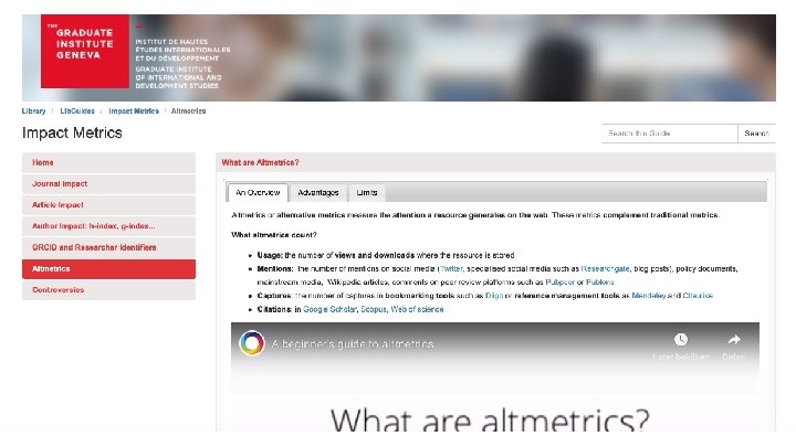 Online Learning • For example: Libguides The graduate institute Geneva http: //libguides. graduateinstitute. ch/metrics/author_imp act