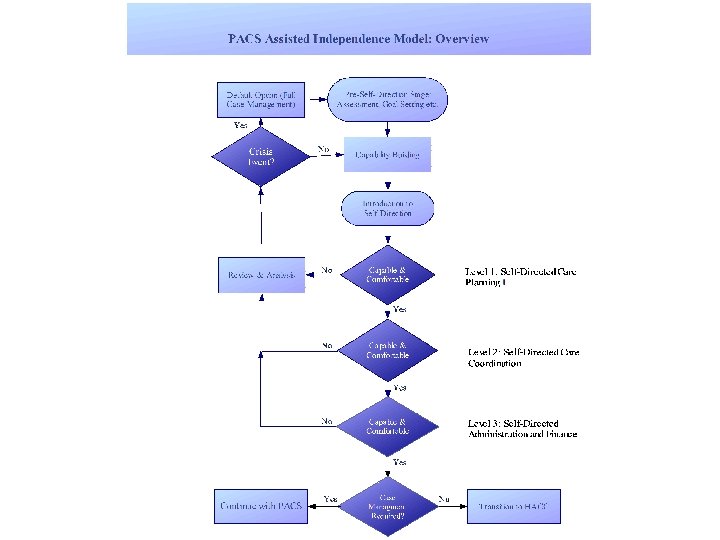 Barriers • Information: – Provision of adequate information is crucial if clients are to be able to take advantage of a SDC model. The research suggests that the lack of information was the single most important barrier in the way of greater self-direction. • Control and Autonomy: – The research suggests that there was still a significant sense that case managers did not sufficiently hand over control to clients. Clients are afraid to lose their case managers. • Flexibility and Choice – A small but significant minority was dissatisfied with the flexibility and choice afforded to them by the model. These boundaries were imposed by government guidelines and the Aged Care Act and, to some degree, by the agency's’ defensive risk management.