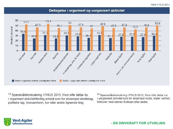Organisert aktivitet Andelen ungdomsskoleelever som er medlem av en organisasjon, klubb, lag eller forening • • Høyere enn landet ellers Variasjon i Agder Kilde: «Ung i Agder 2016»