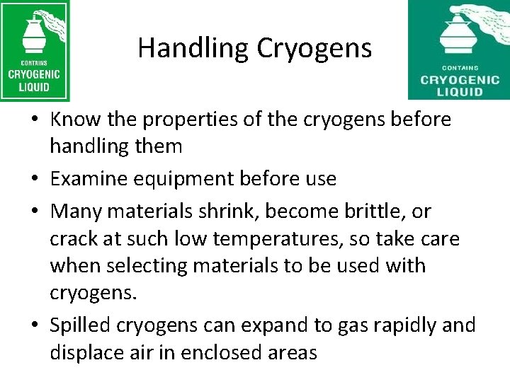 Handling Cryogens • Know the properties of the cryogens before handling them • Examine equipment before use • Many materials shrink, become brittle, or crack at such low temperatures, so take care when selecting materials to be used with cryogens. • Spilled cryogens can expand to gas rapidly and displace air in enclosed areas