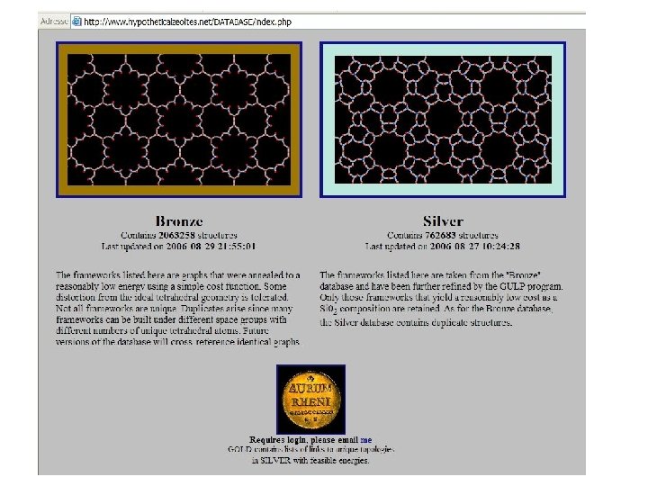 ZEOLITES The structures gathered in the database of hypothetical zeolites are produced from a 64 -processor computer cluster grinding away non-stop, generating graphs and annealing them, the selected frameworks being then re-optimized using the General Utility Lattice Program (GULP, written by Julian Gale) using atomic potentials. M. D. Foster & M. M. J. Treacy - Hypothetical Zeolites – http: //www. hypotheticalzeolites. net/ XX Conference on Applied Crystallography, Wisla, Poland, September 2006