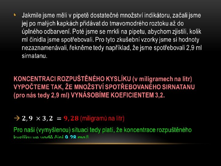 • Po přelití tekutiny do titrační baňky jsme přidali další činidlo – 0, 5 ml škrobového indikátoru. Roztok rázem zbarvil do tmavomodra. Dále jsme nabrali speciálním balonkem do pipety 10 ml dalšího činidla – sirnatanu sodného. Obr. [34] Obr. [35]