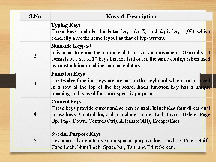 S. No Keys & Description 1 Typing Keys These keys include the letter keys (A-Z) and digit keys (09) which generally give the same layout as that of typewriters. 2 Numeric Keypad It is used to enter the numeric data or cursor movement. Generally, it consists of a set of 17 keys that are laid out in the same configuration used by most adding machines and calculators. 3 Function Keys The twelve function keys are present on the keyboard which are arranged in a row at the top of the keyboard. Each function key has a unique meaning and is used for some specific purpose. 4 Control keys These keys provide cursor and screen control. It includes four directional arrow keys. Control keys also include Home, End, Insert, Delete, Page Up, Page Down, Control(Ctrl), Alternate(Alt), Escape(Esc). 5 Special Purpose Keys Keyboard also contains some special purpose keys such as Enter, Shift, Caps Lock, Num Lock, Space bar, Tab, and Print Screen.