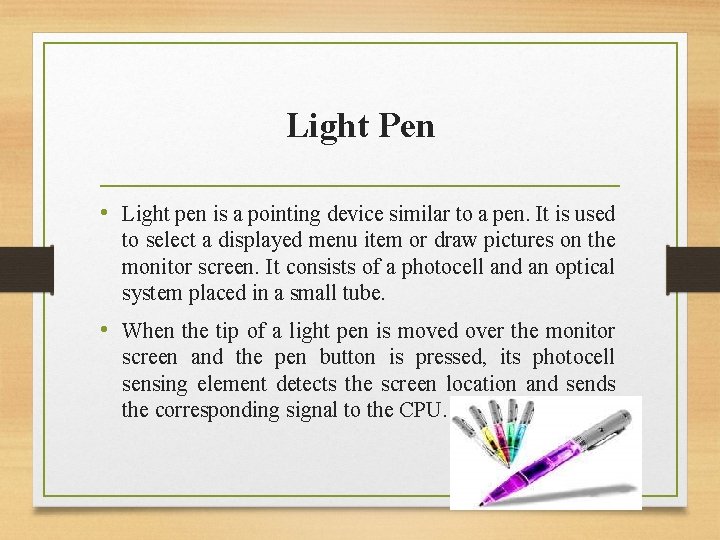 Light Pen • Light pen is a pointing device similar to a pen. It is used to select a displayed menu item or draw pictures on the monitor screen. It consists of a photocell and an optical system placed in a small tube. • When the tip of a light pen is moved over the monitor screen and the pen button is pressed, its photocell sensing element detects the screen location and sends the corresponding signal to the CPU.