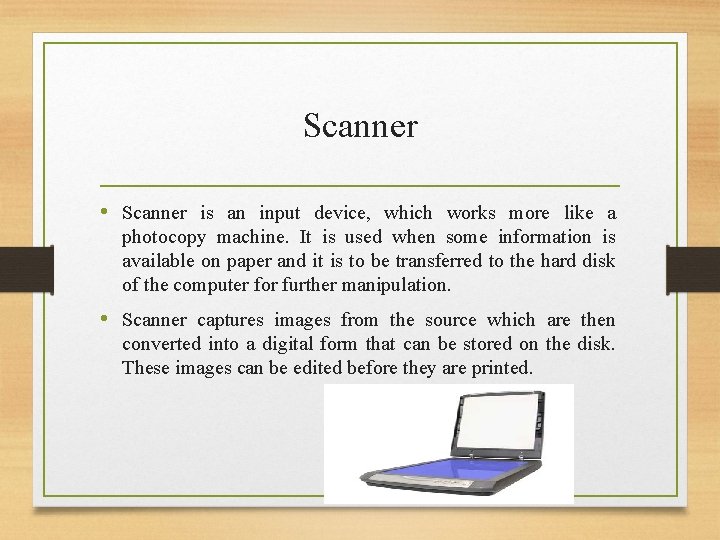 Scanner • Scanner is an input device, which works more like a photocopy machine. It is used when some information is available on paper and it is to be transferred to the hard disk of the computer for further manipulation. • Scanner captures images from the source which are then converted into a digital form that can be stored on the disk. These images can be edited before they are printed.