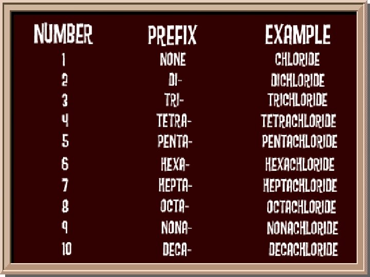 Naming Compounds • When you have two different elements, there are usually only two words in the compound name. • The first word is the name of the first element. • The second word tells you the second element and how many atoms there are in the compound. • The second word usually ends in IDE. That's the suffix. • When you are working with non-metals like oxygen (O) and chlorine (Cl), the prefix (section at the beginning of the word) of the second element changes based on how many atoms there are in the compound. It's like this. . .