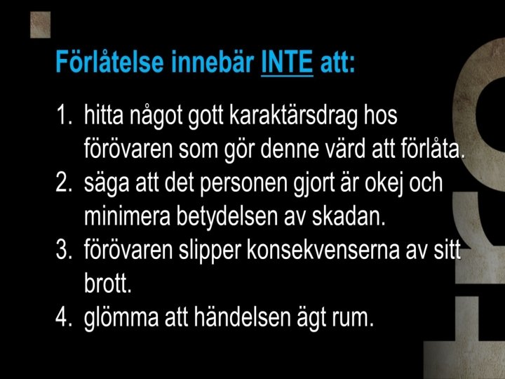 DE FYRA VÄGARNA TILL FÖRLÅTELSE: 1. Att berätta 2. Att sätta ord på det som gör ont 3. Att ge förlåtelse 4. Att förnya eller släppa taget om relationen.