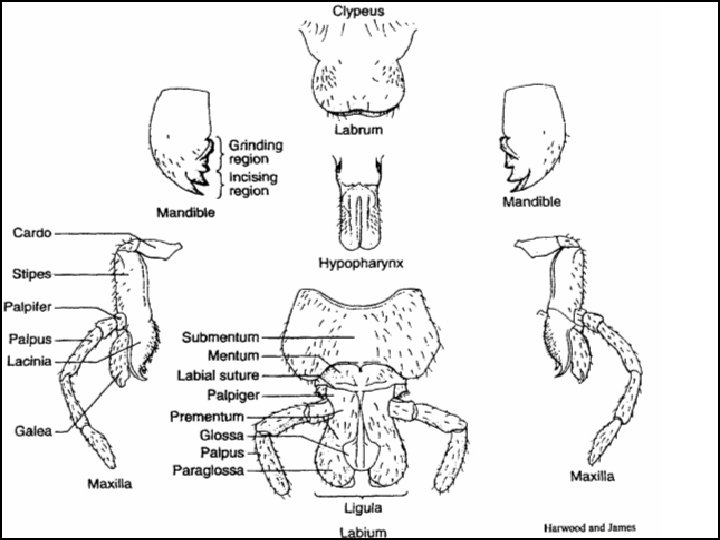 Mouthparts � Labrum is a simple fused sclerite, often called the upper lip and moves longitudinally which is hinged to the clypeus. � Mandibles (jaws) are a highly sclerotized pair of structures that move at right angles to the body; used for biting, chewing and severing food. � Maxillae are paired structures that can also move at right angles to the body and possess segmented palps. � Labium (lower lip) is the fused structure that moves longitudinally and possesses a pair of segmented palps. � hypopharynx is a somewhat globular structure, arising from the base of the labium. It assists
