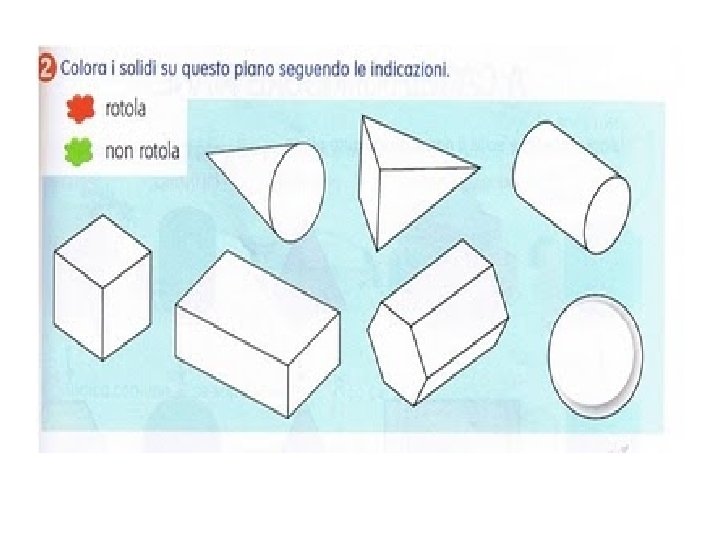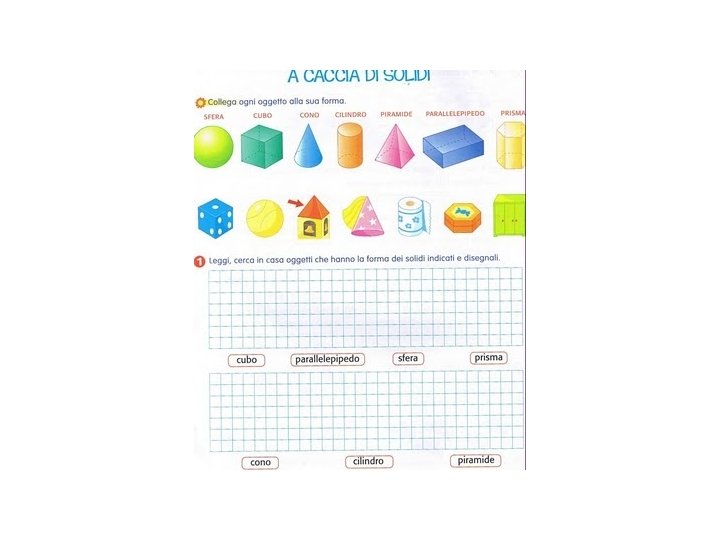 Intervento sugli obiettivi sociali: Le abilita di parlare sottovoce e uno alla volta verranno insegnate attraverso il modellamento (esemplificazione) da parte del docente Fasi dell’attivita Primo incontro: un’ora aula immagine - Chiedere agli alunni cosa devono fare. - Chiedere agli alunni di domandarsi cosa dovranno fare - Presentare il materiale da utilizzare - Leggere sul libro la pagina relativa ai “Solidi” - Ricercare nell’aula solidi uguali (piramidi, parallelepipedi, cubi, coni, cilindri, sfere prismi). - Chiedere ai gruppi di classificarli (specifico per l’alunno div. abile) Secondo incontro: un’ora e 30 minuti – aula immagine - Chiedere agli alunni di sintetizzare le informazioni della lezione precedente - Presentare scatole vuote di farmaci e chiedere di ricostruire il solido - Consegnare modello del solido rappresentato su foglio - Invitare a ricalcare il modello su cartoncino - Far colorare i solidi con colore prestabilito usando le tempere (ogni gruppo avra modelli di grandezza diversi) (specifico per l’alunno div. abile) - Far ritagliare il modello e chiuderlo con colla (specifico per l’alunno div. abile) - Far compilare una tabella sulle caratteristiche dei solidi (lavoro collettivo)