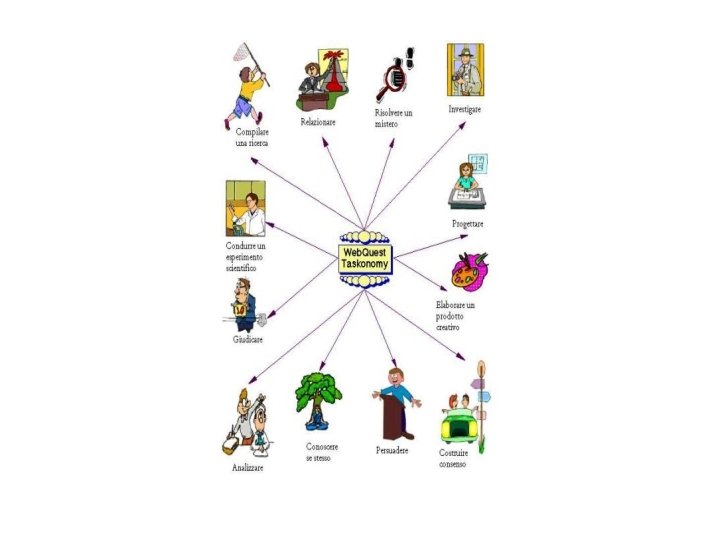 Punti di forza dei webquest 1. Apprendere in situazione: - attivita basata sull’esperienza - attivita basata sul tentativo di risolvere problemi (ricerca di informazioni piu importanti, di immagini esplicative. . . ) - riflessione sugli errori 2. Apprendere insieme - lavoro tra pari - interdipendenza - condivisione dell’attivita - superamento dei conflitti - integrare tutti gli alunni 3. Rafforzare la motivazione - diventare protagonisti dell’apprendimento - lavorare sulla dinamicita : continui aggiornamenti, modifiche del testo. . .