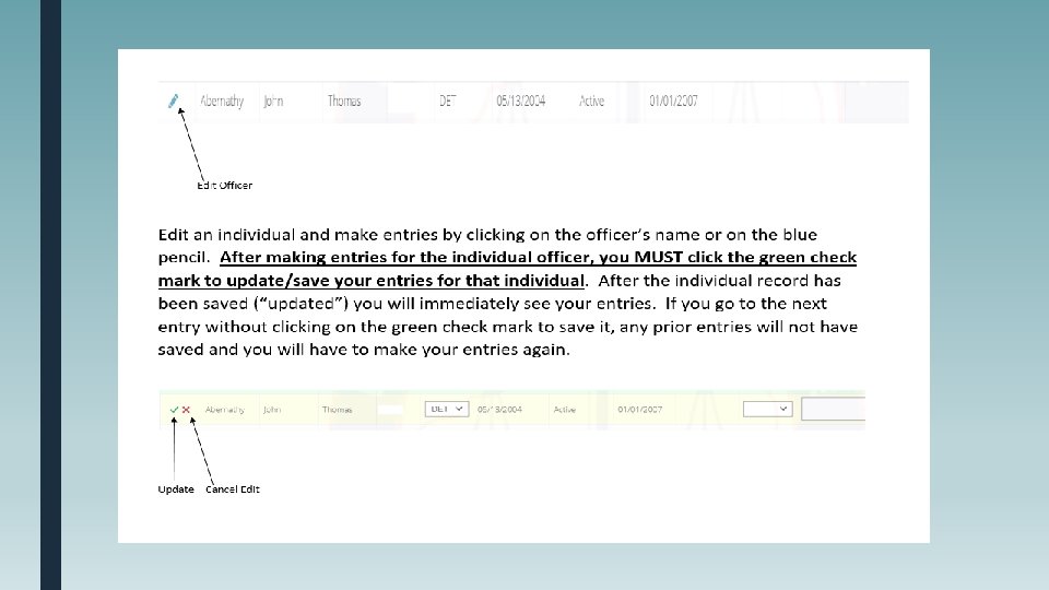 To edit a record……. ■ Click on the Pencil Icon at the left of the officer’s name to open the record. ■ At a minimum, you must complete the “In Service Completed” and “Qualified” columns for each officer. ■ If you indicate anything other than “Y” for “In Service Completed” you must also include an entry in the “REASON” column (inactive, separated (date), etc. ) ■ For officer’s whose Firearms Status is “Y” (authorized to carry) and you indicate anything other than “Y” in the “Qualified” column, you must also include an entry in the “REASON” column. ■ Submit Change in Status or Report of Separation forms as needed. ■ IMPORTANT: After you have completed the entry for EACH officer, you MUST click on the check mark at the left of the officer’s name in order to save your entry. If you fail to do so, your entry will NOT be saved! (You may want to ensure your entries have been saved and all columns completed before moving to a new screen in the report. )
