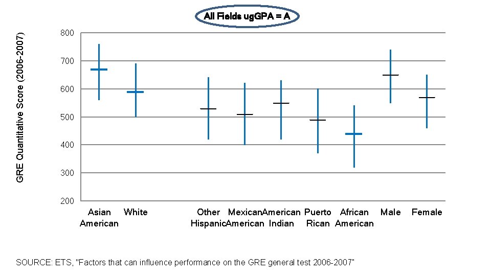 Physical Sciences GRE Quantitative Score (2006 -2007) 800 700 600 500 400 300 200 Asian American White Other Mexican American Hispanic American Indian Puerto Rican African American SOURCE: ETS, "Factors that can influence performance on the GRE general test 2006 -2007” Male Female