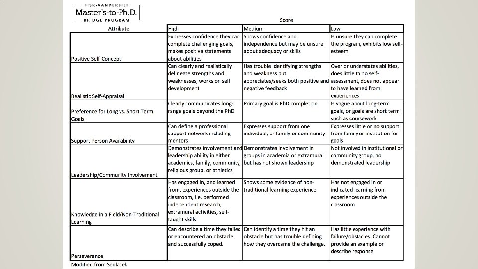 DIMENSION OF FIT HIGH MEDIUM LOW research interests align with multiple faculty in multiple subfields research interests align with multiple faculty in one subfield limited alignment between student interests and faculty expertise faculty someone wants to hire as RA now someone could supervise, but and/or there is a clear fit with current interests do not directly support a faculty expertise faculty member's work faculty aligned with applicant's interests are not seeking students community has clearly contributed positively to applicant only discusses him/herself; no some evidence of participating in prior department/school culture, and evidence of engagement in department or service activities would do the same for our program university activities diversity belongs to an underrepresented identity group; first generation in applicant has been an active advocate contributions to diversity are unclear from college or low SES; and/or for diversity in physics the application contributes to another type of diversity the department seeks program mission fits a unique program goal, e. g. , wants to be a community college teacher, entreprenuer, etc. Background and interests generally a good fit for the program's focus Student interests and experience do not seem well-suited for this particular program's focus geography student has expressed a significant reason for wanting to be at/near our location some desire for our location no mention of geography potential exemplar © JRP 2018 consistent excellence in and beyond strong and well rounded in and out limited evidence of potential for exemplary coursework and research of school scholarship and/or program participation