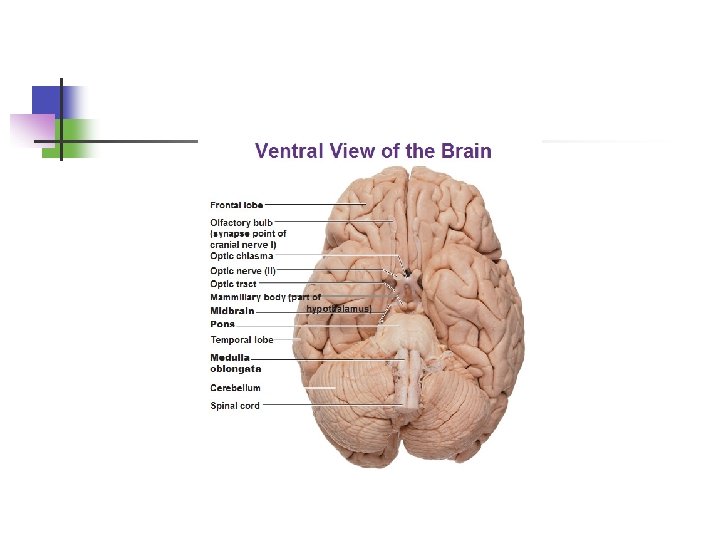 Human Brain n n Frontal Lobe- associated with reasoning, planning, parts of speech, movement, emotions, and problem solving Parietal Lobe- associated with movement, orientation, recognition, perception of stimuli Occipital Lobe- associated with visual processing Temporal Lobe- associated with perception and recognition of auditory stimuli, memory, and speech Cerebellum - associated with regulation and coordination of movement, posture, and balance.
