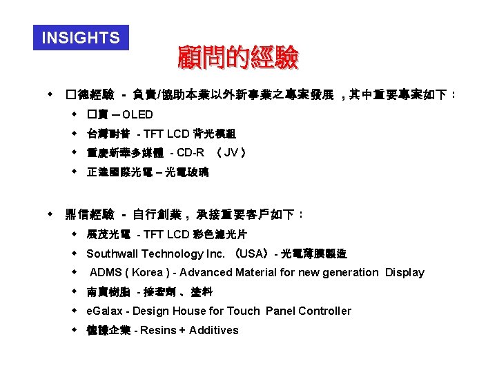 INSIGHTS w 1980 - 86 ICI Taiwan 貿易事業部 業�品部 - 業務代表、業務經理、部門經理 w 87 - 88 ICI Chemicals & Polymers , UK - Product Manager, Marketing Manager w 89 - 92 高雄塑 �公司( KMC , 為 ICI/中石化 JV) - 商務部經理 w 93 - 95 ICI Taiwan - 貿易事業部 總經理 w 95 - 98 ICI China - 董事總經理 ( Managing Director )