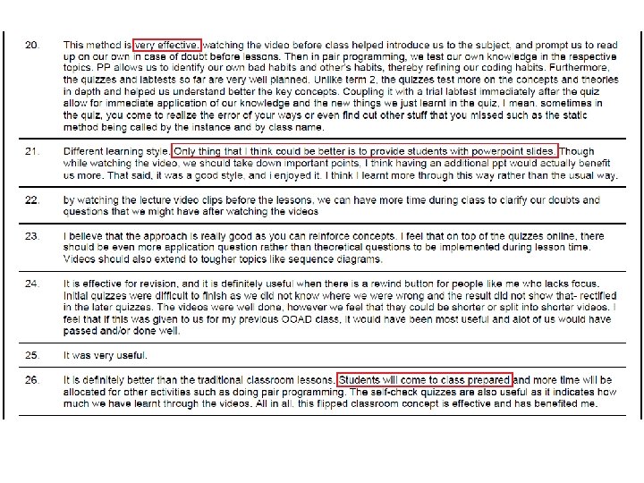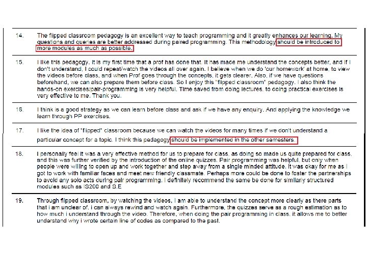 My Strategy • Before class: – Watch video lectures – Complete self-check quiz (about 4 -5 MCQ/short answer questions) in e. Learn • During class: – Any questions? (15 mins) – Pair programming (1. 5 hrs) – Debrief for pair programming (15 mins) • Other class activities: – Project presentations & critique – Short lecture on design principles + exercsies