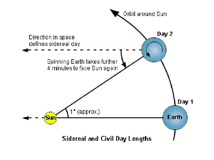 Length of Day How long is a day? Is it 24 hours or 23 hrs. 56 minutes? Sidereal Day = actual time it takes to rotate 3600 (23 h 56 m). But, earth revolves around sun 10 in a day. So, it takes an additional 4 minutes to complete turn. Solar Day = Noon to Noon = Time it takes to rotate 3610 (24 h).